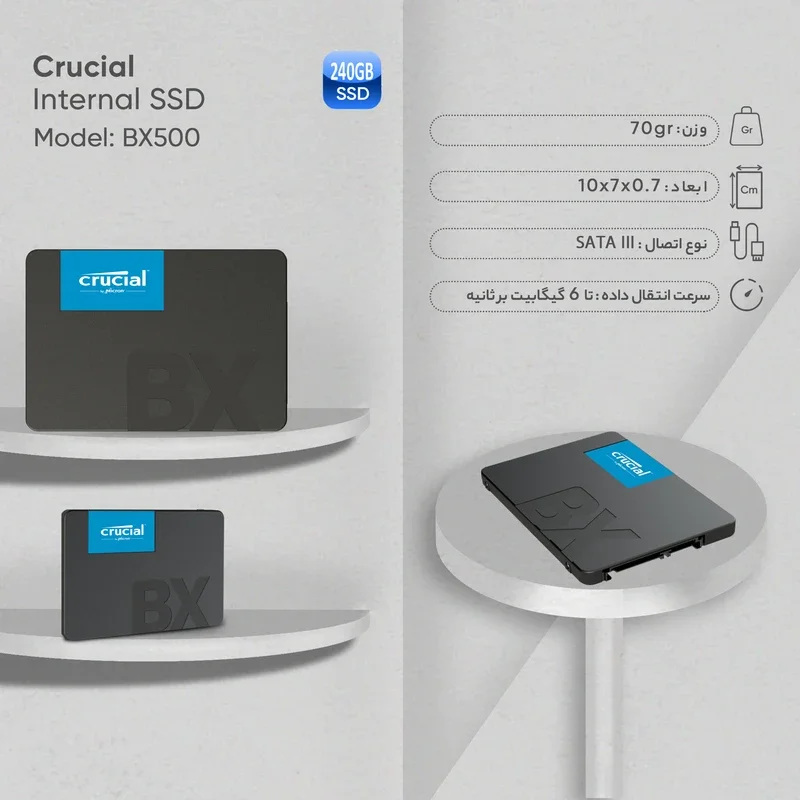 اس اس دی اینترنال «BX500» شرکت کروشیال (Crucial)، از طریق رابط SATA3.0 به کامپیوتر متصل میشود و با سرعت بسیار خوبی به انتقال اطلاعات میپردازد. فرم فاکتور حافظهی BX500 از نوع 2.5 اینچ است و از ظرفیت 240 گیگابایت بهره میبرد. از مزیتهای دیگر حافظههای اس اس دی مصرف انرژی کم آنهاست. حافظهی اس اس دی BX500 در برابر شوک و لرزش مقاوم است و هنگام استفاده از آن نگران ازدستدادن اطلاعات نخواهید بود. 1.5 میلیون ساعت عمر مفید برای این محصول اعلامشده است که بسیار مطلوب است. شرکت کروشیال یکی از تولیدکنندگان خوشنام تجهیزات ذخیرهسازی است.