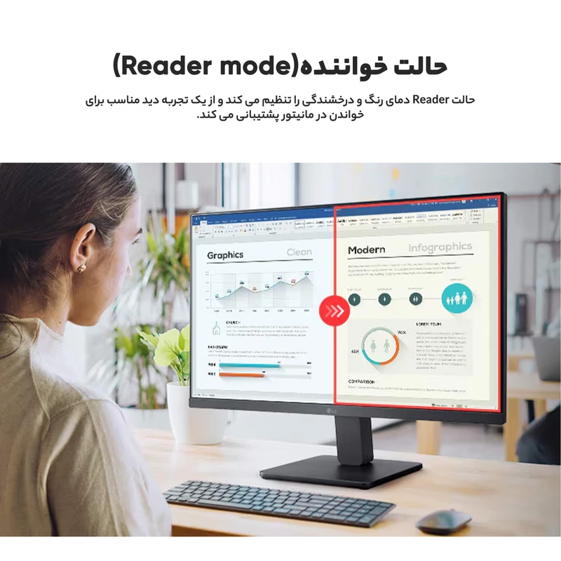- قابلیتهای فنی مانیتور: حالت مطالعه (Reader Mode)، حالت بهبود تشخیص رنگ (Color Weakness)، کاهش تاخیر ورودی (Dynamic Action Sync)