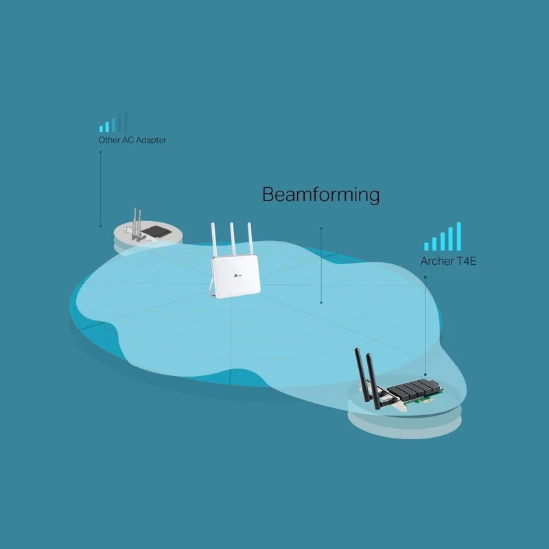 با استفاده از کارت شبکه بی سیم تی پی لینک مدل Archer T4E میتوانید کامپیوتر شخصی خود را با سرعت بالا و بی سیم به شبکه متصل نمایید. این کارت شبکه از وای فای 5 پشتیبانی میکند. کارت شبکه وایرلس تی پی لینک TP-Link Archer T4E در دو باند فرکانسی 2.4 و 5 گیگاهرتز فعالیت میکند و سرعت مجموع وای فای قابل ارائه توسط آن برابر با 1200 مگابیت در ثانیه است. سرعت وای فای در باند های 2.4 و 5 گیگاهرتز به ترتیب برابر با 300 و 867 مگابیت در ثانیه است. کارت شبکه Archer T4E به آسانی از طریق رابط PCI-Express X1 به کامپیوتر متصل میشود و آن را به یک دستگاه بی سیم قابل شناسایی برای سایر تجهیزات بی سیم در شبکه تبدیل میکند.