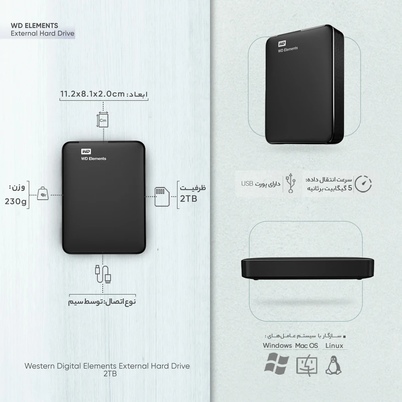 هارد اکسترنال Elements محصولی از برند وسترن دیجیتال (Western Digital) است. این هارد اکسترنال با استفاده از رابط USB 3.0 به کامپیوتر وصل میشود و میتواند به مکان امنی برای انتقال اطلاعات شما تبدیل شود. ارائهی هارداکسترنال Elements در ظرفیتهای متنوع آن را برای نیازهای گوناگون افراد جذاب کرده است.